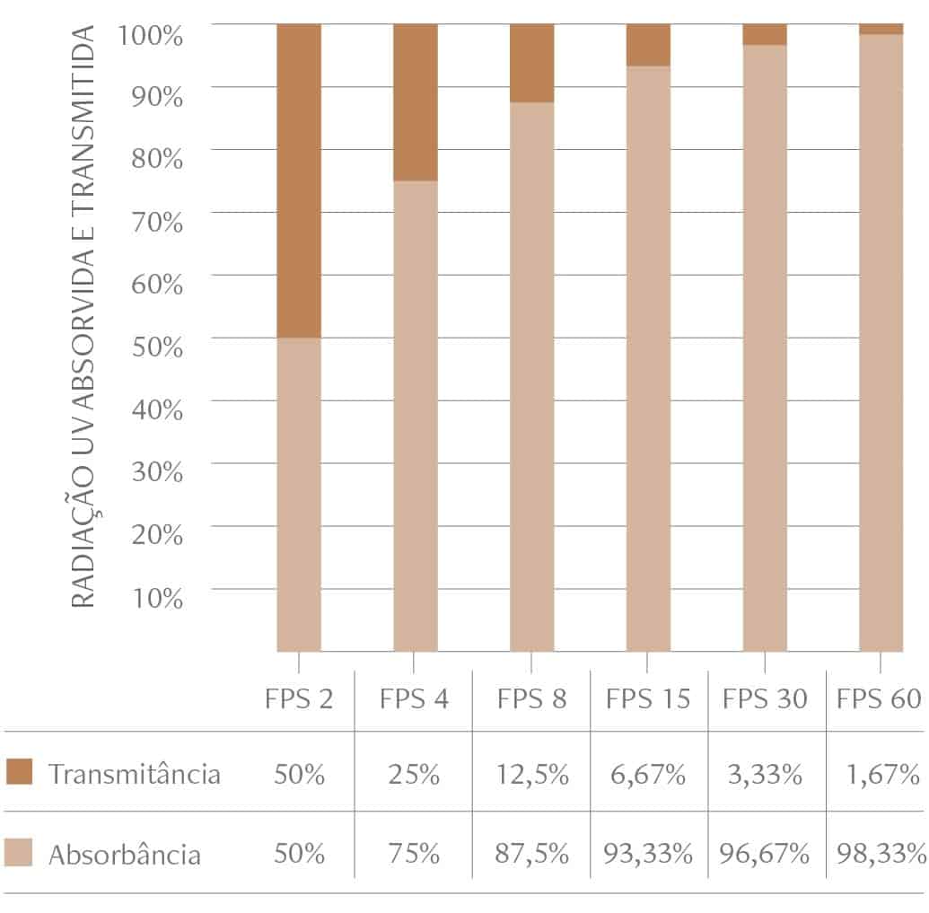 Observe que, se considerarmos apenas a proteção, os protetores com FPS 30 e com FPS 50 não têm uma diferença muito significativa. Isso, porque o FPS 30 é capaz de filtrar 96,7% da radiação, enquanto o FPS 50 filtra 98,3%. Porém, ao analisar o quanto de radiação passa pelos filtros e atinge a pele, temos 3,3% no FPS 30 e 1,7% no FPS 50.